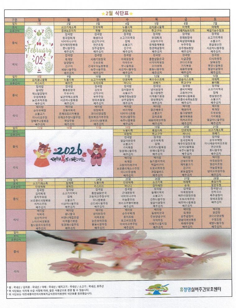 식단표 게시판 상세 제목 2월 식단표 입니다. 작성자 관리자(cmcare) (218.150.17.72) 작성날짜 2026-01-29 11:23:37 조회수 8 첨부파일 26.2월 식단표.pdf 내용 보기 이전글 26년 1월 식단표 입니다. 2025-12-29