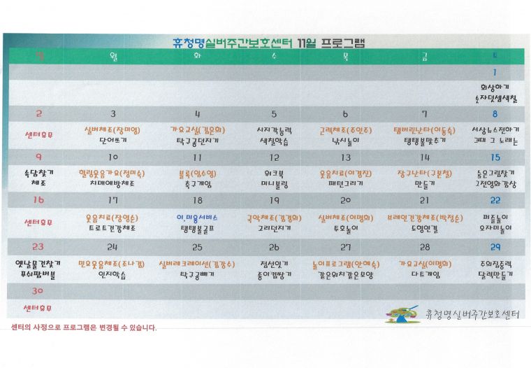 프로그램 게시판 상세 제목 11월 프로그램표 입니다. 작성자 관리자(cmcare) (218.150.17.72) 작성날짜 2025-11-01 14:51:00 조회수 5 첨부파일 25.11월 프로그램.pdf 내용 보기 이전글 10월 프로그램표 입니다. 2025-09-28