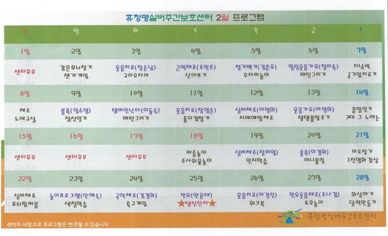 프로그램 게시판 상세 제목 2월 프로그램표 입니다. 작성자 관리자(cmcare) (218.150.17.72) 작성날짜 2026-01-29 11:23:05 조회수 25 첨부파일 26.2월 프로그램.pdf 내용 보기 이전글 26년 1월 프로그램표 입니다. 2025-12-29